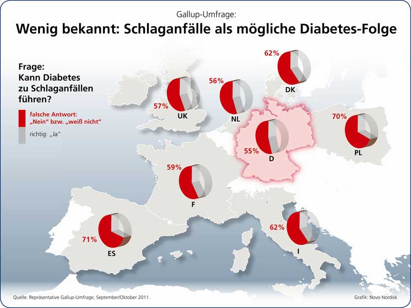 Was weiß die deutsche Bevölkerung über Diabetes und mögliche Folgeerkrankungen? Wie sieht im Vergleich dazu der Wissenstand in anderen europäischen Ländern aus? Die Ergebnisse einer repräsentativen Gallup-Umfrage, die im Auftrag des forschenden Pharmaunternehmens Novo Nordisk durchgeführt wurde, zeigen erhebliche Wissenslücken.Rund 4.000 repräsentativ ausgewählte Teilnehmer aus acht europäischen Ländern beantworteten Fragen rund um Diabetes, Symptome und Früherkennung, mögliche Begleiterkrankungen sowie zum Lebensstil. Die Ergebnisse weisen deutlich auf den Bedarf weiterer Informations- und Aufklärungsanstrengungen zum Thema Diabetes hin.