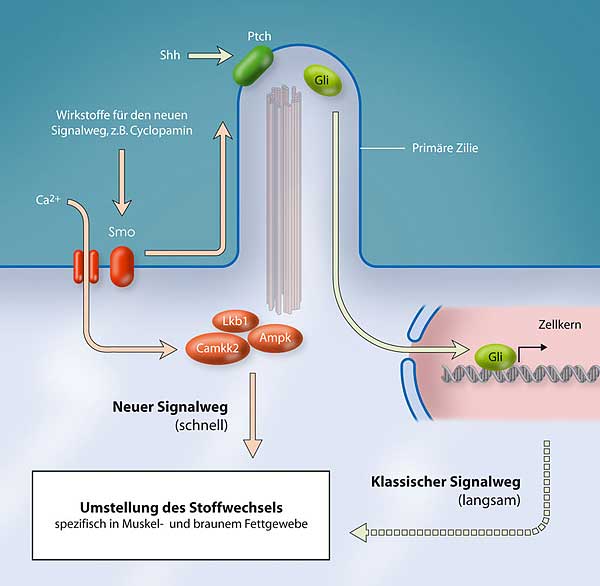 Die neuen Ergebnisse liefern nun eine Erklärung für die Muskelkrämpfe und zeigen, dass eine bereits bekannte, einfache und sichere Zusatzbehandlung die unerwünschten Wirkungen unterbinden kann. Die Forscher haben nämlich einen neuen, von der bisher bekannten Aktivierung von Transkriptionsfaktoren und Genen unabhängigen, Hedgehog-Signalweg entdeckt. Über diesen Weg steuern Zellen ihren primären Energiestoffwechsel, darunter den Glukose-, Fettsäure- und Aminosäurestoffwechsel.