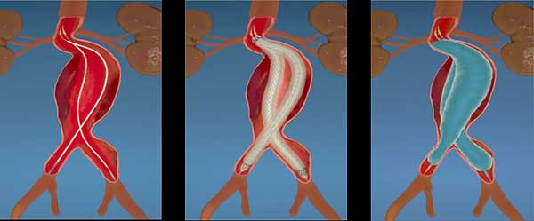 Bildunterschrift: Die Grafik verdeutlicht den Wirkmechanismus der neuen Gefäßprothese. Über die linke und rechte Leistenarterie wird jeweils ein Katheter unter Röntgenkontrolle in den Bereich des Bauchaorten-Aneurysmas vorgeschoben (li.). Über die beiden Katheter werden die Prothesen, die aus zwei flexiblen Gefäßrohren (Stents) bestehen, im Aneurysma platziert (mi.). Rund um die beiden Stents, die zukünftig den Blutfluss ermöglichen, wird in einen Kunststoffsack eine Masse (Polymer) gespritzt, die aushärtet und das Volumen des Aneurysmas komplett versiegelt (re.). Dadurch sitzt die Prothese im Gefäß fest und kann nicht verrutschen.