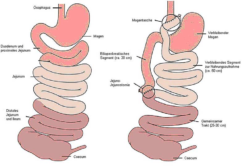 Der größere Teil des Magens wird operativ "blind" verschlossen und verbleibt im Körper und wird, zusammen mit dem Zwölffingerdarm und Teilen des Dünndarms, von der Nahrungspassage ausgeschlossen. Die Gewichtsabnahme durch die Operation beträgt im statistischen Durchschnitt 60 Prozent des extremen Übergewichts. Die Gewichtsreduktion geht in der Regel auch mit einer Verbesserung der Begleiterkrankungen wie Diabetes, Bluthochdruck und Herzinsuffizienz einher. Die Sterberate sinkt im Vergleich zu einer Kontrollgruppe um bis zu 40 Prozent.