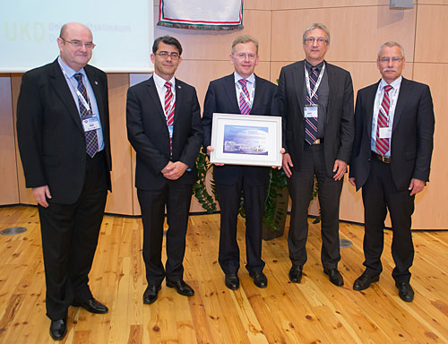 Bildunterschrift: Dr. Tibor Hidvégi, Generalsekretär der Ungarischen Diabetes-Gesellschaft, Prof. Dr. László Barkai, Präsident der Ungarischen Diabetes-Gesellschaft, Prof. Dr. Michael Roden, Preisträger und Wissenschaftlicher Geschäftsführer des DDZ sowie Dr. Ferenc Kosiczky und Dr. Tibor Iványi, beide Vertreter des unterstützenden Unternehmens Lilly.