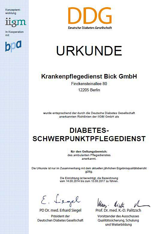 Diabetes ist die Volkskrankheit Nr. 1 in Deutschland. Mehr als sechs Millionen Menschen sind betroffen, das gilt vor allem für ältere und pflegebedürftige Typ-2-Diabetespatienten. Sie benötigen spezielle Beratung und Behandlung, damit sie so wenig wie möglich unter der Krankheit leiden und so selbstständig wie möglich bleiben. Um eine qualitativ hochwertige Pflege zu gewährleisten, zertifiziert die Deutsche Diabetes Gesellschaft (DDG) Einrichtungen, die hohe definierte Anforderungen erfüllen. Die Krankenpflegedienst Bick GmbH hat jetzt von der DDG das Zertifikat ["Diabetes-Schwerpunktpflegedienst"] erhalten.Diabetes mellitus, auch als Zuckerkrankheit bekannt, ist eine komplexe Erkrankung mit unterschiedlichen Ausprägungen. Betroffen sind Menschen aller Altersgruppen, aber mit zunehmendem Alter steigt das Erkrankungsrisiko. Unter pflegebedürftigen Patienten beträgt der Anteil der Menschen mit Diabetes rund ein Drittel und mit dem steigendem Durchschnittsalter der Bevölkerung wird diese Patientengruppe wachsen. Die Krankheit ist durch die regelmäßige Einnahme von Medikamenten und eine angepasste Ernährung relativ gut kontrollierbar. Gerade pflegebedürftige Patienten benötigen jedoch qualifizierte Beratung und Hilfe. Dazu gehört auch, Anzeichen von Unterzuckerung und auf Gangunsicherheiten aufgrund von Nervenstörungen zu erkennen. Außerdem kann Diabetes zu verschiedenen Folgeerkrankungen führen, was wiederum speziellen Pflegebedarf bedeutet. Die Körperpflege ist bei Diabetikern besonders wichtig, weil ihre Haut sehr anfällig für Infektionen ist. Zudem kann ihre Wundheilung gestört sein, weshalb selbst kleinste Verletzungen, vor allem an den Füßen, besondere Aufmerksamkeit erfordern.
