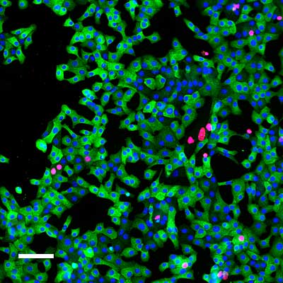 Bildunterschrift: In Kultur gehaltene Inselzellen der Maus, die das Gen Ifi202b überexprimieren (grün). Die Zellkerne der sich nicht teilenden Zellen sind blau. Die Zellkerne der sich teilenden Zellen sind pink. Maßstab: 50 Mikrometer