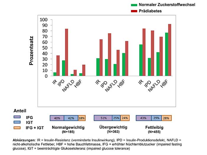 Basierend auf dem zunehmenden Wissen über das Vorliegen der verschiedenen Phänotypen des Stoffwechsels, die den stoffwechselgesunden fettleibigen Menschen und den stoffwechselkranken normalgewichtigen Menschen charakterisieren, haben die Wissenschaftler die Häufigkeit der vier Risiko-Phänotypen unter den unterschiedlichen BMI-Kategorien (Normalgewicht, Übergewicht, Fettleibigkeit) bei Menschen mit normalen Blutzuckerwerten und bei Menschen mit Prädiabetes untersucht. Sie konnten zeigen, dass zwischen den BMI Kategorien eine unterschiedliche Verteilung dieser Phänotypen vorliegt (Abbildung). Während z. B. ein Insulinproduktionsdefekt der mit Abstand häufigste Risiko-Phänotyp bei normalgewichtigen Menschen mit Prädiabetes ist, nehmen die Häufigkeiten der Fettleber und des vermehrten Bauchfettgehalts bei übergewichtigen und adipösen Menschen deutlich zu.
