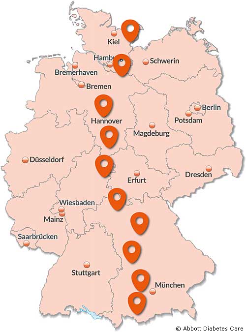 12 Teilnehmer, 1001 km, ein Ziel: In neun Tagen auf E-Bikes durch ganz Deutschland radeln - vom Timmendorfer Strand bis zur Zugspitze. Dieser Herausforderung stellen sich vom 15.-23. August 2016 12 Menschen mit Diabetes. Unter dem Motto "Sattelfest - Das Ziel im Blick" startet erstmalig die "Tour de Diabetes", welche eindrucksvoll zeigen soll, dass Sport und Diabetes sich keineswegs ausschließen. Als Partner haben die Fahrer die Sponsoren Bosch mit leistungsstarken E-Bike-Motoren sowie Abbott mit dem Flash Glukose Messsystem FreeStyle Libre an ihrer Seite. Unterstützt werden sie zudem durch winDiab, dem wissenschaftlichen Institut für niedergelassene Diabetologen, dem Auftragsforschungsinstitut Profil (Institut für Stoffwechselforschung) und durch den hessischen Fahrradhersteller Riese und Müller mit seinen E-Bikes. Schirmherr ist die gemeinnützige Organisation diabetesDE - Deutsche Diabetes-Hilfe. Organisiert wird die Tour de Diabetes von der Agentur "feen - kongress & event".Auf die (E-Bike)-Pedale, fertig, los!, heißt es ab dem 15. August 2016 im Rahmen der ersten "Tour de Diabetes", die einmal längs durch Deutschland führt. Vom Startpunkt Timmendorfer Strand aus radeln die Teilnehmer zuerst Richtung Lüneburg, in den anschließenden Tagen geht es dann südwärts über Hannover (16.08), Friedland (17.08.), Bad Salzungen (18.08.), Schweinfurt (19.08.), Nürnberg (20.08.), Donauwörth (21.08.), Ammersee (22.08.) bis zur Zugspitze (23.08.). Die Besonderheit an der Tour: Obwohl sie ganz unterschiedlichen Altersklassen angehören, haben alle Teilnehmer einen Typ-1- oder Ty-2-Diabetes. Ein Blick auf das Starterfeld zeigt: 12 Teilnehmer bedeuten auch 12 verschiedene (Lebens)Geschichten. Die jüngste Teilnehmerin ist 28 Jahre alt, die älteste Teilnehmerin 72 Jahre.