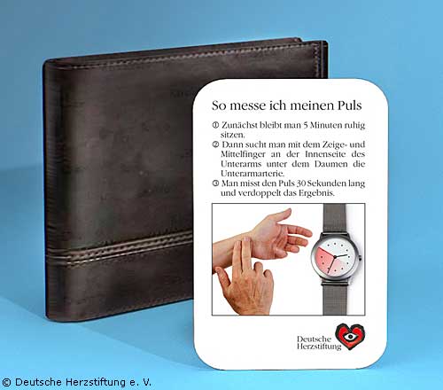Die kostenfreie Pulskarte zur selbständigen Pulsmessung (Scheckkartengröße) kann angefordert werden bei der Deutschen Herzstiftung, Bockenheimer Landstr. 94-96, 60323 Frankfurt/Main, Tel. 069 955128-400, unter www.herzstiftung.de/puls-messen oder per E-Mail unter bestellung@herzstiftung.de