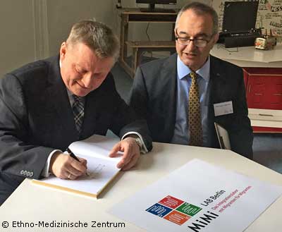 Bildunterschrift: Eintrag ins Gästebuch: Bundesgesundheitsminister Hermann Gröhe (links) und Ramazan Salman, Geschäftsführer Ethno-Medizinisches Zentrum e.V. (EMZ), bei der Eröffnung des MiMi LAB in Berlin.