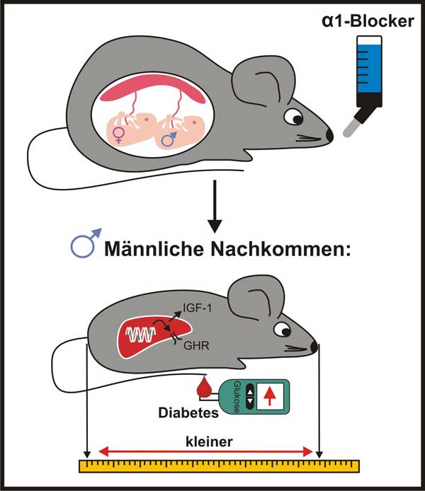 Ein Forschungsteam des Center of Brain, Behavior and Metabolism (CBBM) der Universität zu Lübeck konnte im Mausmodell zeigen, dass eine Alpha1-adrenerge Blockade während der Schwangerschaft zu einem verringerten Wachstum und im Erwachsenenalter zu Diabetes führen kann. Interessanterweise zeigten nur die männlichen Nachkommen der behandelten Mäuse dieses Krankheitsbild. Die Studie wurde in in "Molecular Metabolism" online am 1. Juli 2017 veröffentlicht.