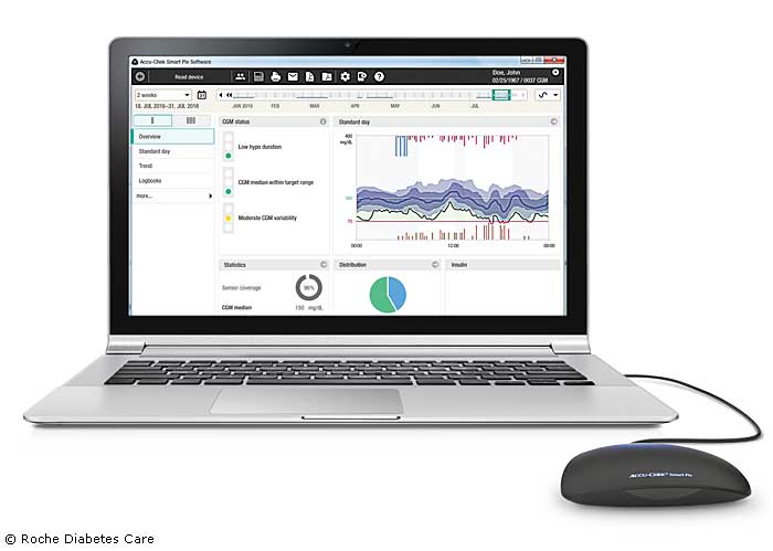 CGM-Systeme (Continuous Glucose Monitoring), die laufend den Glukosegehalt im Gewebe messen, liefern täglich große Datenmengen. Accu-Chek Smart Pix Software 3.0 bietet Ärzten eine zuverlässige digitale Lösung für die Auswertung dieser Datenflut und einen einfachen Überblick über die wichtigsten Berichte. Die Daten werden - unabhängig davon, welches System der Patient nutzt - schnell und automatisch übertragen. Die automatische Muster- und Mahlzeitenerkennung ermöglicht effizientere Therapieentscheidungen und die gezielte Anpassung der Diabetestherapie.