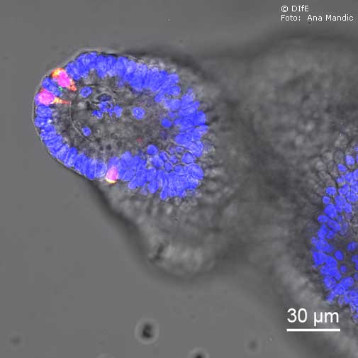 Bildunterschrift: Repräsentatives immunfluoreszenzmikrosokopisches Bild von Kolonorganoiden von Mäusen nach einer 7-tägigen Inkubation mit hitzeinaktivierten Zellen von Clostridium ramosum