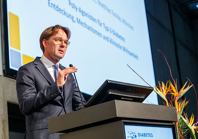 Matthias Tschöp beschäftigt sich in seiner Forschung mit den Botenstoffen, die über Kommunikation zwischen Magen-Darm System und Gehirn Blutzucker, Stoffwechsel und Appetit steuern. Er entschlüsselte dabei entscheidende Signalwege wie zum Beispiel das Hungersignal Ghrelin. Gemeinsam mit dem Chemiker Richard DiMarchi entwickelte Tschöp neue Wirkstoff-Kandidaten zur Behandlung von Typ-2-Diabetes und Adipositas, sogenannte Poly-Agonisten, die die gleichzeitige Wirkung mehrerer Hormone imitieren. In klinischen Studien haben sich einige dieser Poly-Agonisten inzwischen als äußerst vielversprechend zur verbesserten Behandlung von Adipositas und Typ-2-Diabetes erwiesen und befinden sich jetzt bereits in klinischen Phase 2 und 3-Studien. Die Auszeichnung ist mit der prestigeträchtigen Paul-Langerhans-Vorlesung auf dem Deutschen Diabetes Kongress verbunden. Tschöp gab in seinem Vortrag einen Überblick über Mechanismen und Wirksamkeit der von ihm und seinem Team entdeckten Poly-Agonisten.