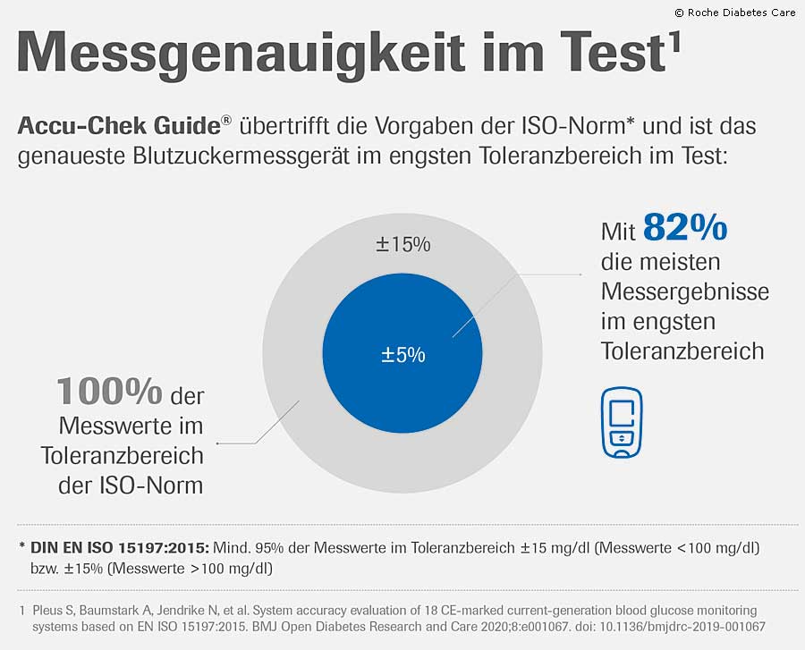 Zuverlässige Blutzuckermesswerte sind wie ein Kompass im Diabetesalltag: Als Wegweiser für Therapieentscheidungen und Orientierung zur Stoffwechseleinstellung ist die Genauigkeit der Messergebnisse essentiell, um die Therapieziele zu erreichen. Das Accu-Chek Guide Blutzuckermessgerät hat die international geltenden Richtlinien zur Messgenauigkeit im Rahmen einer aktuellen Studie[1] erneut erfüllt. Im Vergleich von insgesamt 18 Blutzuckermessgeräten liefert Accu-Chek Guide im besonders engen Toleranzbereich die genauesten Ergebnisse und übertrifft so deutlich die Vorgaben der ISO-Norm (DIN EN ISO 15197:2015).In einer vergleichenden Studie des Instituts Diabetes-Technologie der Universität Ulm wurden 18 aktuell in Europa erhältliche Blutzuckermessgeräte hinsichtlich ihrer Messgenauigkeit untersucht. Maßgeblich waren hierbei die Kriterien der DIN EN ISO 15197:2015, die Qualitätsstandards für Blutzuckermessgeräte vorgeben. Accu-Chek Guide hat die Vorgaben der ISO-Norm zur Messgenauigkeit zu 100 % erfüllt und liefert darüber hinaus in einem besonders engen Toleranzbereich, der zusätzlich getestet wurde, die genauesten Messergebnisse. Diese strengeren Richtwerte sind zwar nicht zur Erfüllung der ISO-Norm gefordert, ihre Angabe wird jedoch empfohlen.[2] Je enger der Toleranzbereich gewählt wurde, desto deutlicher fielen die Unterschiede zwischen den Blutzuckermessgeräten aus: Im Toleranzbereich gemäß ISO-Norm erfüllten 14 der 18 getesteten Geräte die Anforderungen, im engeren Toleranzbereich von ±10 mg/dl bzw. ±10 % waren es hingegen nur noch drei Geräte.