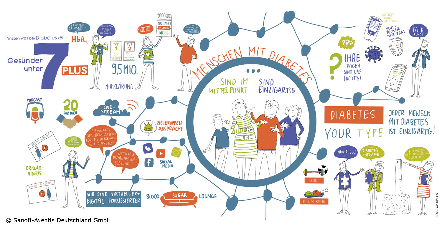Am 18. März 2021 war es soweit, "Wissen was bei Diabetes zählt: Gesünder unter 7 PLUS" meldete sich im neuen Format zurück. Antworten auf die Fragen zum Thema Diabetes wurden im Rahmen eines interaktiven Experten-Talks gegeben und die vielfältigen Themen in Worten und Bildern festgehalten.Viele Fragen rund um Diabetes sind mit einem intensiven Blick beantwortet: Ein Live-Zeichner hat die vielen Inhalte des halbstündigen Diabetes-Talks mitgezeichnet. Aus komplexen Themen wurden verständliche Bilder, Symbole und Worte.