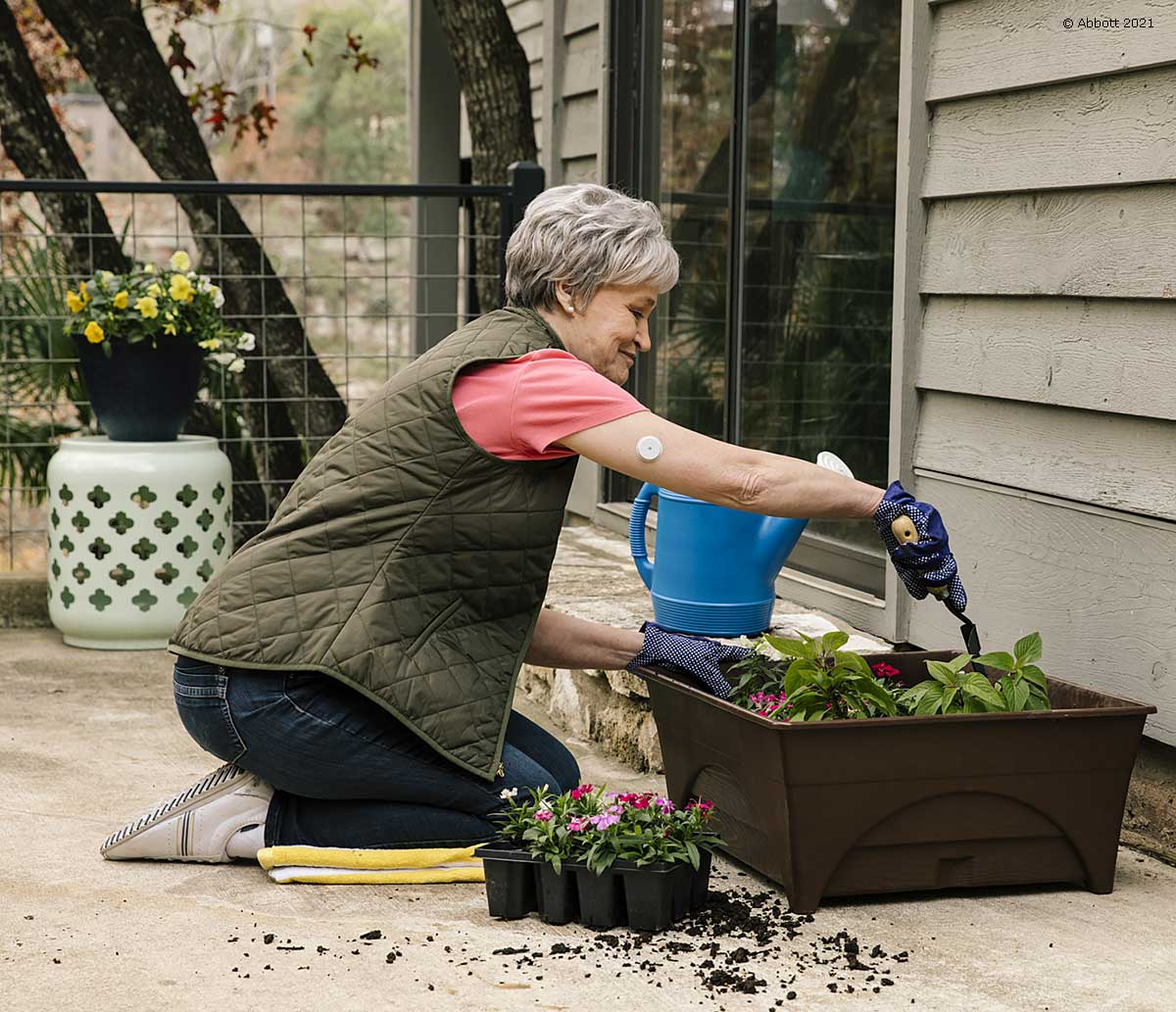 Typ-2-Diabetikerin mit FreeStyle Libre pflanzt Blumen.