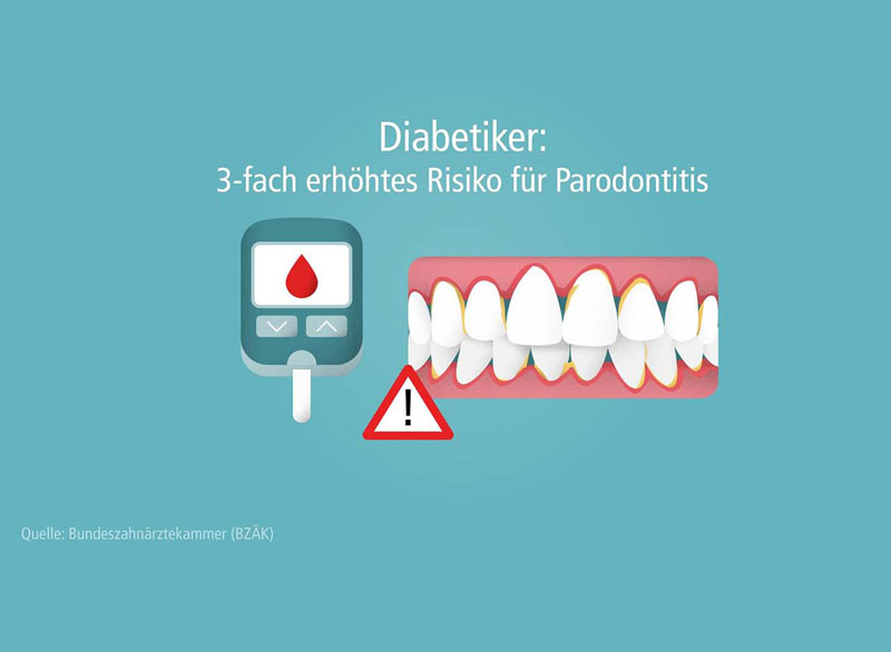 Umgekehrt haben Diabetiker ein dreifach erhöhtes Risiko für eine Parodontitis im Vergleich zu Nicht-Diabetikern. Denn der erhöhte Blutzuckerwert begünstigt Entzündungen. Menschen mit schlecht eingestelltem Diabetes verlieren insgesamt mehr Zähne durch eine Parodontitis als Nicht-Diabetiker.