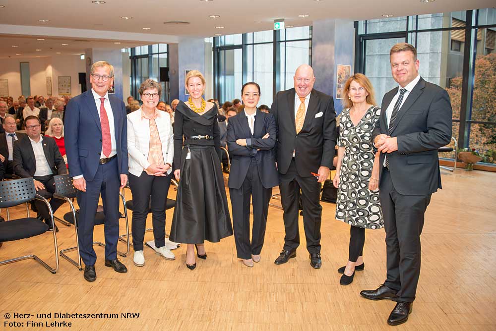 Bildunterschrift: Staffelstabübergabe am HDZ NRW: Von links nach rechts: Prof. Dr. Jan Gummert (Ärztlicher Direktor HDZ NRW), Prof. Dr. Andrea Tannapfel (Dekanin Medizinische Fakultät, Ruhr-Universität Bochum), Dr. Karin Overlack (Geschäftsführerin HDZ NRW), Prof. Dr. med. Susanne Reger-Tan (neue Klinikdirektorin Diabetologie und Endokrinologie HDZ NRW), Prof. Dr. med. Dr. h.c. Diethelm Tschöpe (ehemaliger Klinikdirektor Diabeteszentrum HDZ NRW), Prof. Dr. Claudia Hornberg (Dekanin Medizinische Fakultät OWL, Universität Bielefeld) und Staatssekretär Matthias Heidmeier (Ministerium für Arbeit, Gesundheit und Soziales des Landes Nordrhein-Westfalen, MAGS.