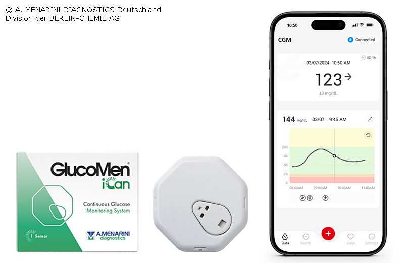 GlucoMen® iCan ist ein werkseitig kalibriertes real-time CGM. Es hat eine zugelassene Tragedauer von 15 Tagen, in denen das System alle 3 Minuten einen Gewebeglukosewert speichert. Für die Datenerfassung und -auswertung, statistische Analysen und ein umfassendes Tagebuch stehen dem Anwender sowohl die intuitiv zu bedienende iCan App für Android und iOS als auch ein separates Empfangsgerät zur Verfügung. Trendinformationen, individualisierbare Alarme, die geringe Größe des Sensors und eine gute Wasserdichtigkeit ergänzen den Komfort für den Träger des GlucoMen® iCan.