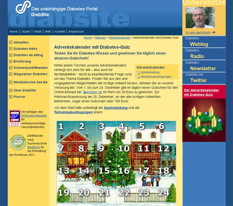 Türchen auf und los geht's. Am 1. Dezember 2013 startet zum zwölften Mal der virtuelle Adventskalender des Diabetes-Portals DiabSite. Unter www.diabsite.de erwartet Diabetiker und Nicht-Diabetiker ein amüsantes Adventsquiz, bei dem sie täglich Wertgutscheine gewinnen können. Hinter jeder Tür verbirgt sich eine Frage zum Thema Diabetes mit drei Antwortmöglichkeiten.