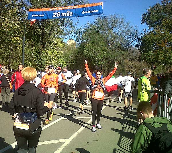 Was war los: war ich etwa zu schlecht trainiert, rächte es sich, dass ich am Vortag über 25 Kilometer durch New York gegangen war? Da wusste ich ja noch nicht, dass der alternative Marathon am nächsten Tag doch stattfinden würde, ich hatte am Abend vor meinem Marathon also schon richtig schwere Beine. War ich bei der für einen Marathon doch deutlich zu geringen Wasserzufuhr jetzt doch dehydriert? Rächte sich der über Stunden deutlich zu hohe Blutzuckerwert jetzt gegen Ende des Marathons? Oder lag es daran, dass ich als Verpflegung nur auf diese "immens wohlschmeckenden" Gels zurückgreifen konnte, etwas, was ich bei meinen früheren Marathonläufen oder im Training nie in einem solchen Maß konsumiere. Folgerichtig habe ich diese dann auch gegen Ende des Laufes wieder den Büschen im Central Park zurück gegeben, mein Magen hat mir unmissverständlich signalisiert, dass er diese klebrige Masse in einem solchen Umfang keinesfalls toleriert.