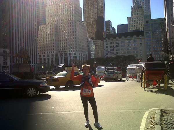 In dem Moment lief eine deutsche Läuferin an mir vorbei, ich humpelte hinter ihr her und fragte sie, ob sie eigentlich eine Ahnung hätte, wie lang eine dieser Runden denn wirklich sei? Klar, sagte sie, eine Mitläuferin hätte die Strecke mit einem Fahrradtacho ausgemessen, es wären knappe 10 Kilometer pro Strecke. Was?! 10 Kilometer, ich hatte gedacht 7. Ja, sieben Kilometer war die historische Strecke durch den Park, aber seit 1970 war der Central Park nochmal umgebaut und renoviert worden und die neue Strecke hatte eine Länge von zehn Kilometern, entgegnete sie mir sehr hilfsbereit. Das änderte ALLES! Ich dankte ihr und ließ sie mit dieser für mich sensationellen Information weiter laufen. Damit hatte ich also den Marathon längst geschafft, ich war ja circa sieben Kilometer vom Hotel in den Central Park gelaufen und hatte schon 3,5 Runden von jeweils 10 Kilometern Länge absolviert - also, Glückwunsch, ich war hier und jetzt erfolgreiche Finisherin des eigentlich abgesagten und doch stattgefundenen New York City Marathons!
